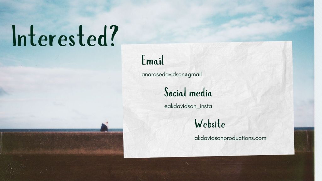 If you would like to collaborate, are seeking to hire a writer, director, or storyboard artist, or would simply like to chat, please reach out to me via email at anarosedavidson@gmail.com